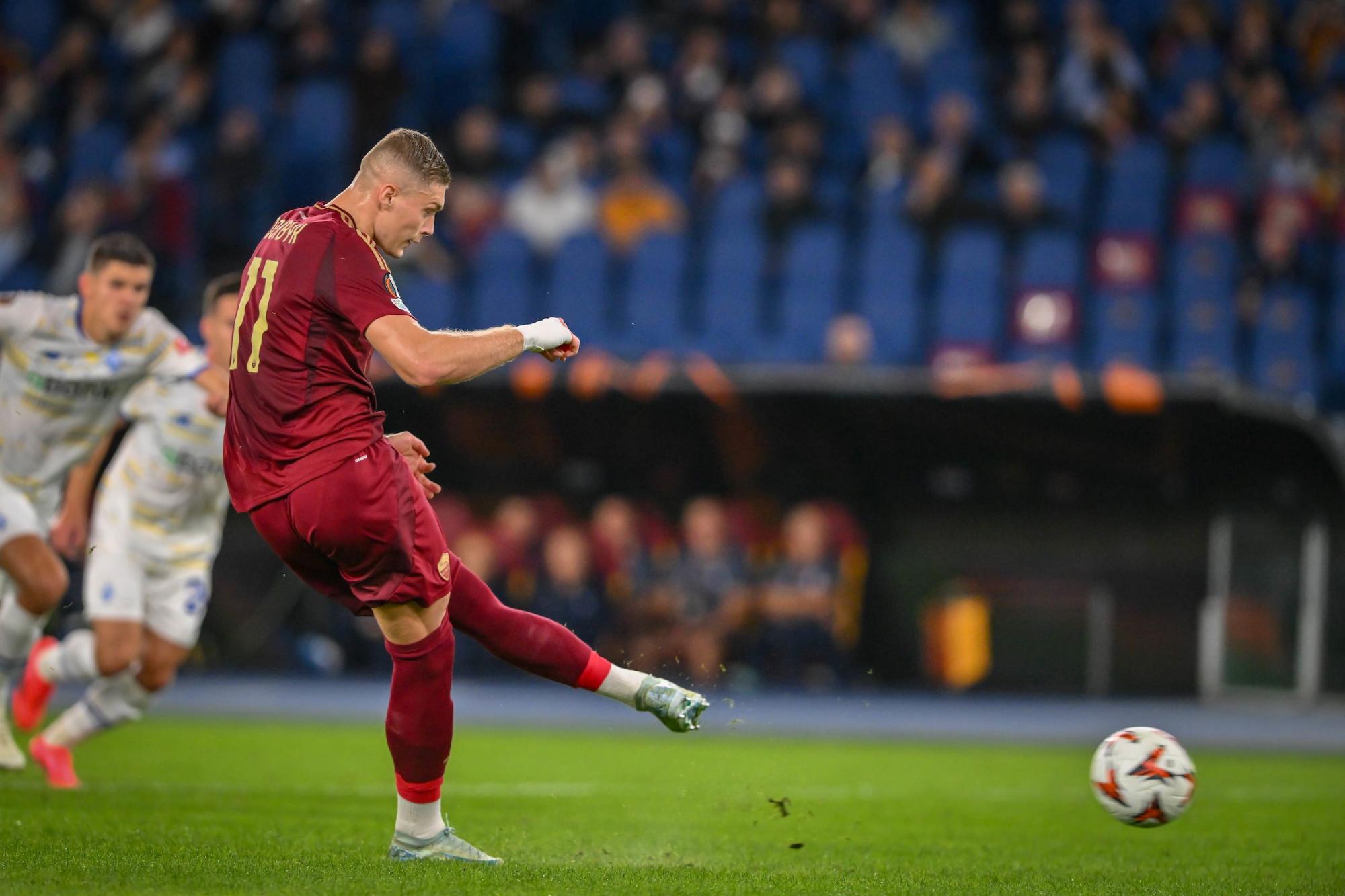 Після одного небезпечного моменту "Рома" відкрила рахунок на екваторі тайму. Гол вийшов нелогічним. Михавко в простій ситуації потягнув Бальданці за шорти на лінії штрафного – пенальті. До позначки підійшов форвард збірної України Довбик і вивів римлян уперед.