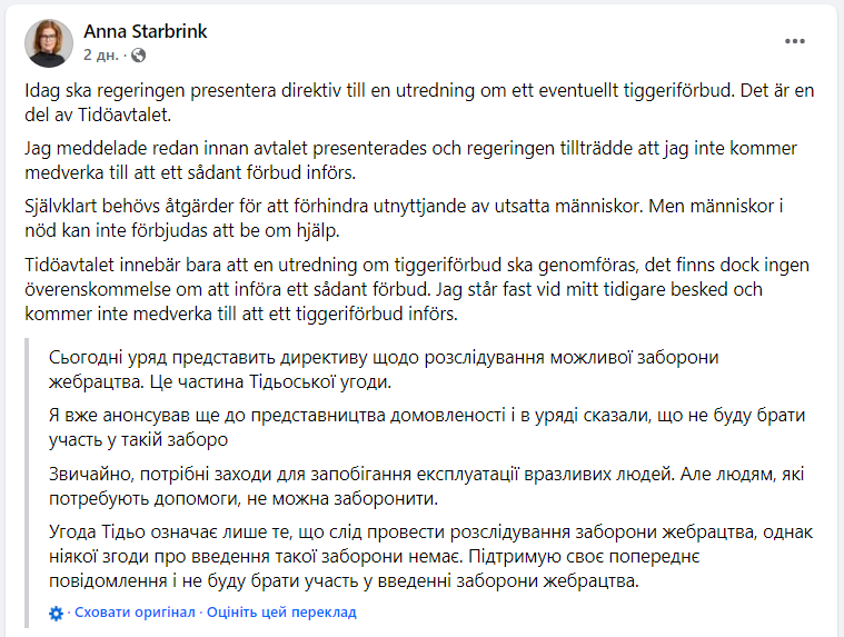 Лідерка шведських ультраправих у парламенті Лінда Ліндберг під час прес-конференції заявила, що йдеться передусім про людей, які приїхали з інших країн ЄС "просити милостиню попід магазинами".