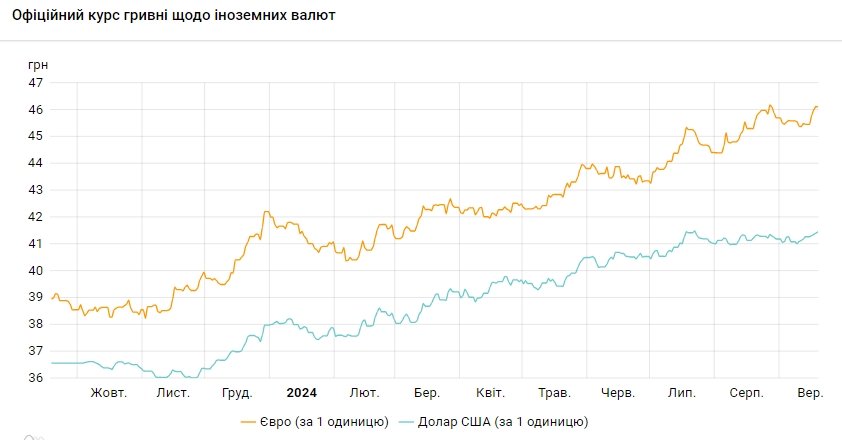 НБУ збільшує курс долара з 9 вересня. За цей час долар подорожчав на 1% (41,01 грн/долар на 8 вересня). Курс наближається до історичного максимуму, який було зафіксовано 22 липня – 41,49 грн/долар.