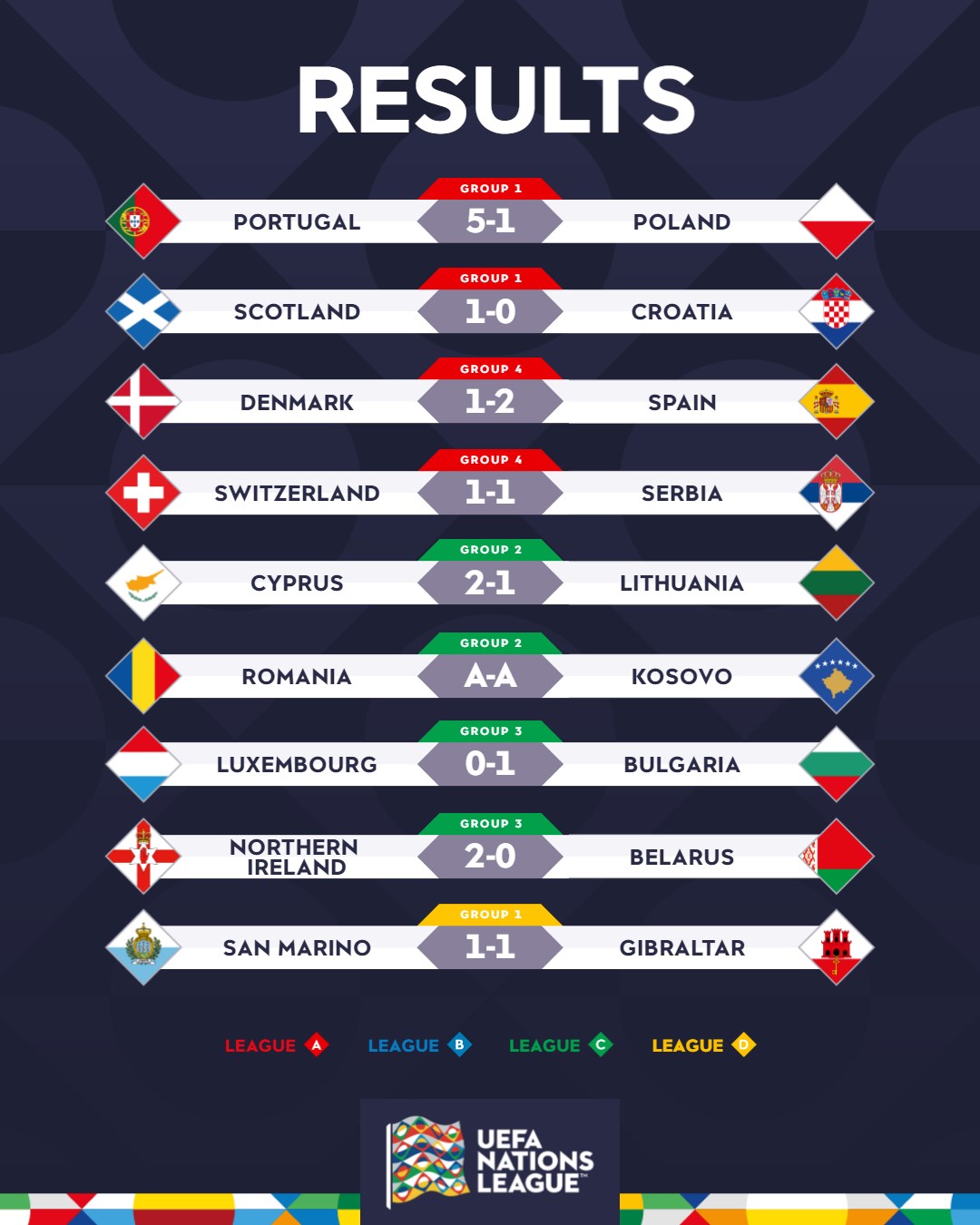 Черговий тур сезону 2024/25 Ліги націй продовжився дев'ятьма матчами в п'ятницю. Перемоги здобули національні команди Португалії, Шотландії, Іспанії, Кіпру, Болгарії та Північної Ірландії.