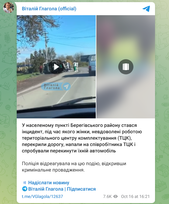 Під час нього "жінки, невдоволені роботою ТЦК, перекрили дорогу, напали на співробітника ТЦК і спробували перекинути їхній автомобіль".