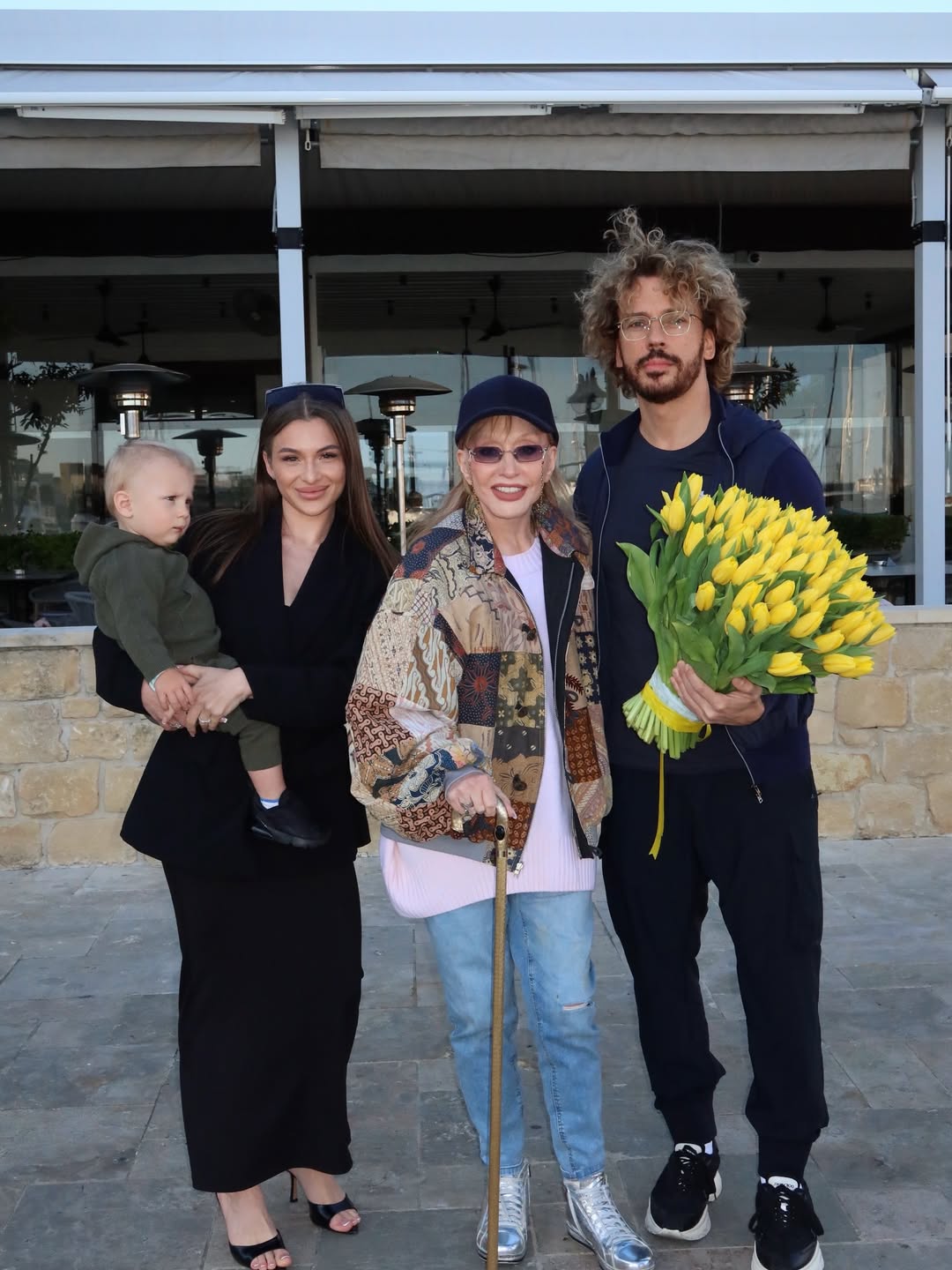 Поруч із зіркою був її чоловік Максим Галкін. Він тримав у руках великий букет яскраво-жовтих тюльпанів і був одягнений у темно-синій спортивний костюм та кросівки.