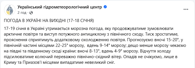 Прогноз погоди в Україні на 17 січня (скриншот: facebook.com/UkrHMC)
