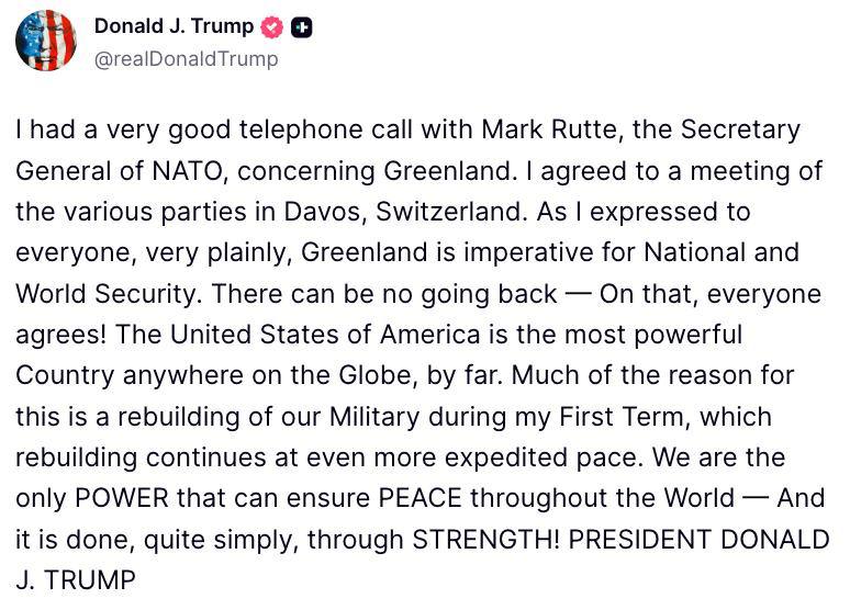 "У мене відбулася дуже хороша телефонна розмова з Марком Рютте, генеральним секретарем НАТО щодо Гренландії. Я погодився провести зустрічі різних сторін у Давосі, Швейцарія", – повідомив Трамп.