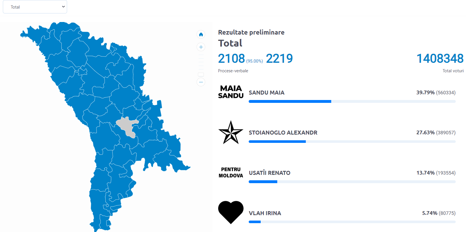 Станом на зараз було оброблено вже 2108 з 2219 протоколів на президентських виборах, що відбулися в Молдові у неділю, 20 жовтня. Це складає рівно 95%.