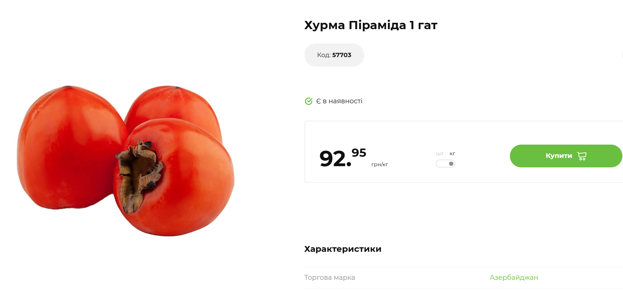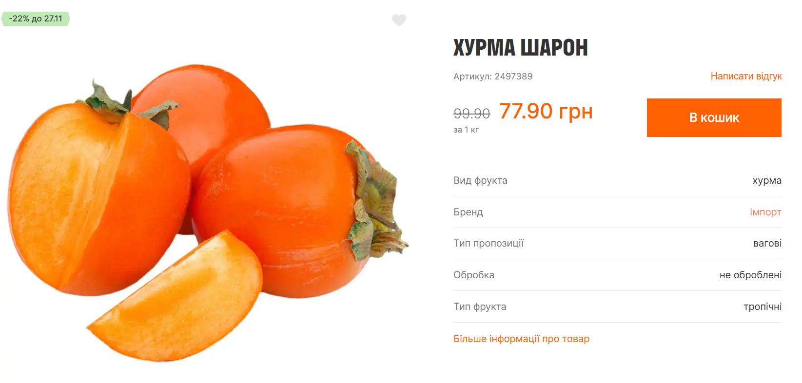 Покупцям Varus пропонують сорт хурми "Шарон" за 77,9 грн/кг, а "Персимону" – за 115,4 грн.