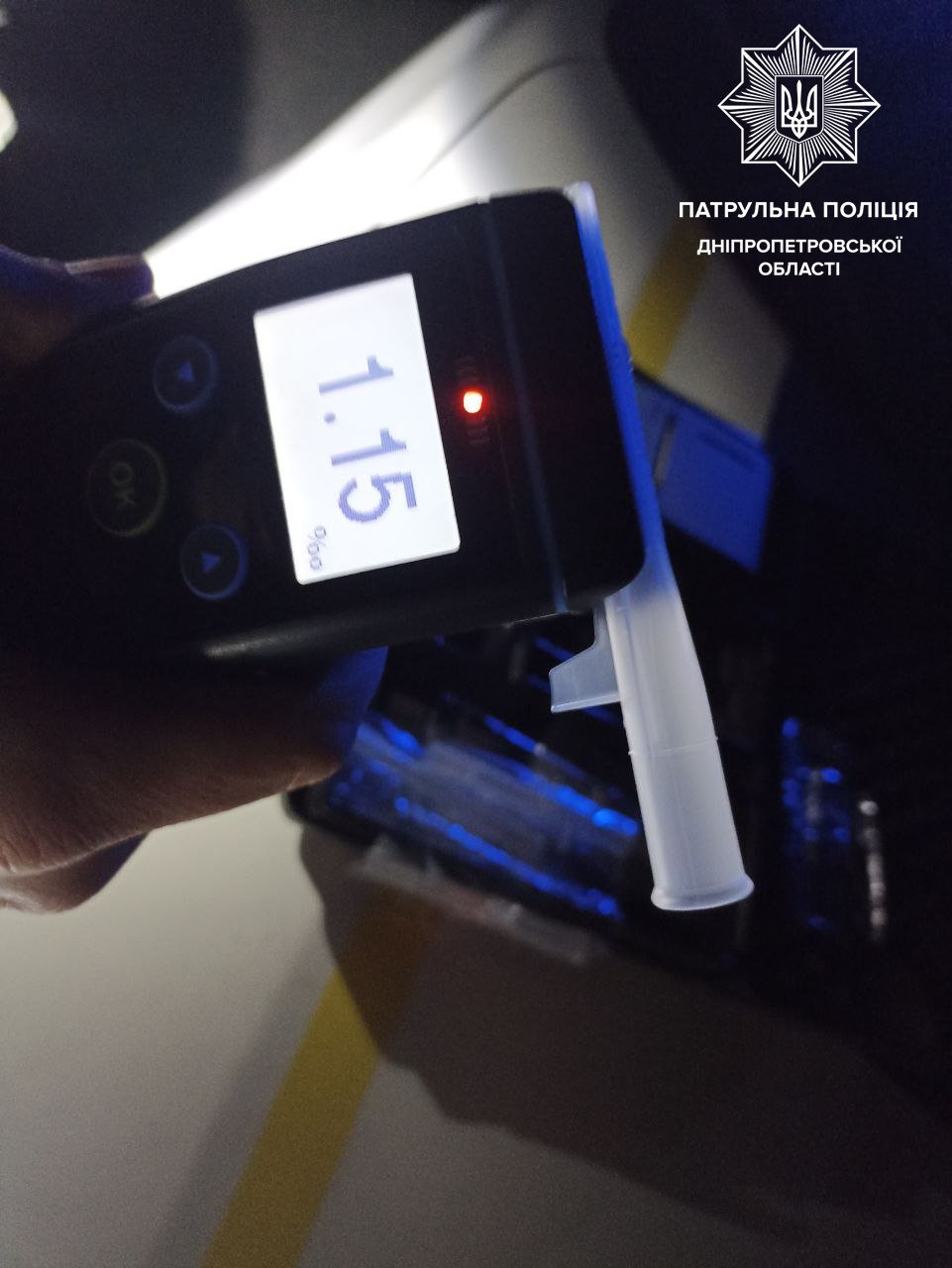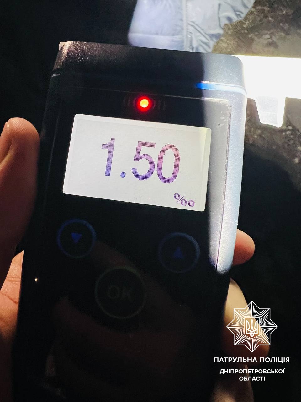 - Чечелівський район: Водія Hyundai зупинили патрульні; освідування показало 1,50 проміле алкоголю.