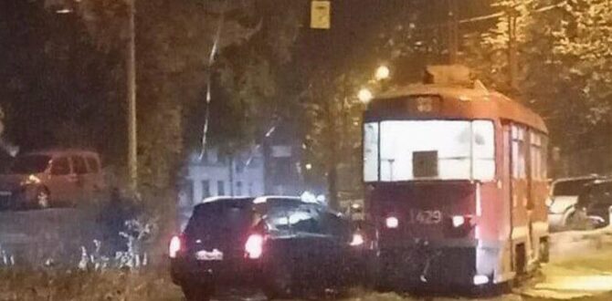 Сьогодні ввечері легкова автівка на швидкості влетіла на колії і врізалася в трамвай, який перевозив пасажирів. Від удару його знесло зі шляху.