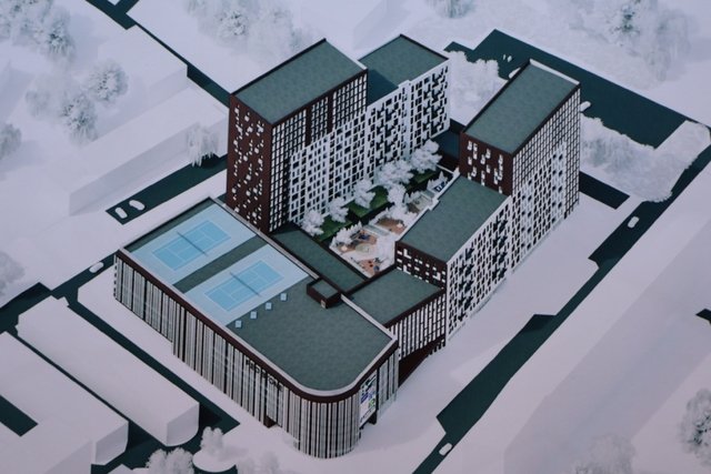 - П'ять секцій житла заввишки від 7 до 15 поверхів. В них будуть 1-кімнатні квартири на 925 мешканців. Перші поверхи в них будуть віддані під магазини та кафе.