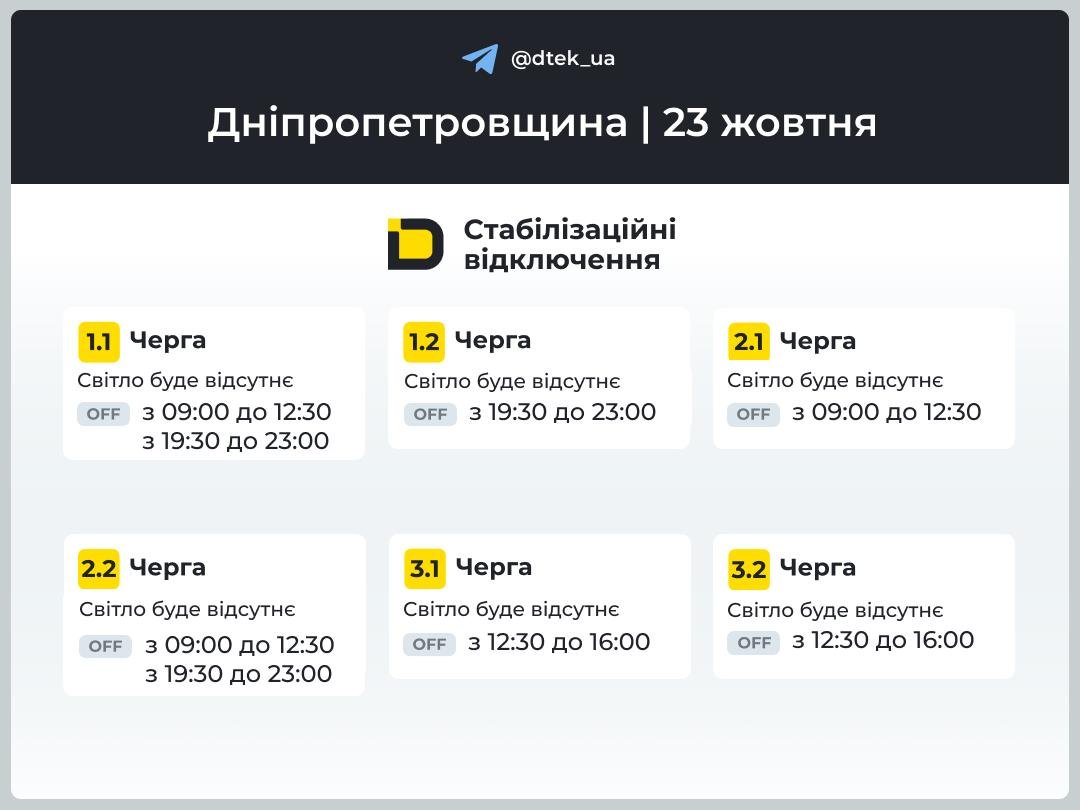 23 жовтня у Дніпрі та області з 07:00 до 23:00 діятимуть стабілізаційні відключення електроенергії. Їх довелось застосувати через наслідки обстрілів. Енергетики досі працюють над відновленням пошкоджень та стабілізацією енергопостачання.