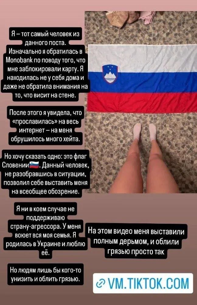 «Я перебувала не у себе вдома і навіть не звернула увагу на те, що висить на стіні. Але хочу сказати одне: це прапор Словенії. Я в жодному разі не підтримую країну-агресорку. У мене вся сім’я воює».