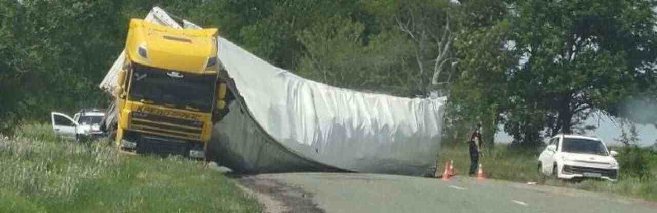 На виїзді з Почино-Софіївки в Магдалинівку сталася ДТП. Водій фури втратив керування, з'їхав на обочину дороги і в нього перекинувся напівпричіп.