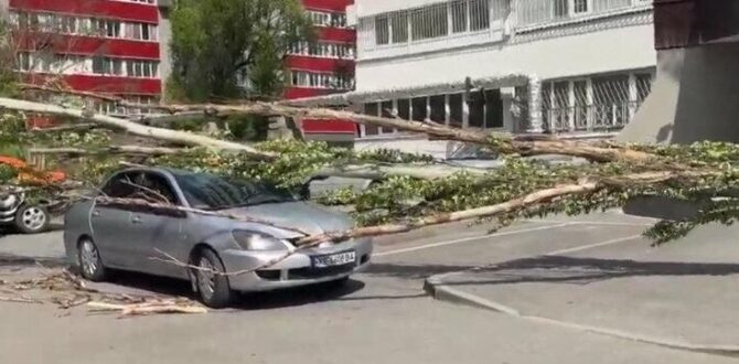 Вже в обідню пору наслідки негоди почали фіксувати на вулицях — дерева падали на автомобілі, тротуари та проїжджу частину.