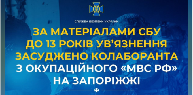 За матеріалами Служби безпеки України суд виніс вирок колаборанту, який співпрацював з окупаційними структурами РФ на тимчасово захопленій території Запорізької області. Його засуджено до 13 років позбавлення волі.