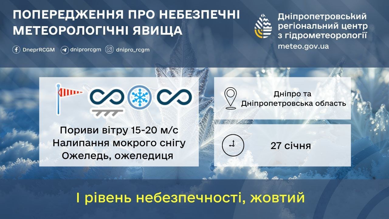 27 січня у Дніпрі та області очікуються пориви південно-східного вітру 15-20 м/с та вдень налипання мокрого снігу (11-34 мм), ожеледь (6-19 мм), на дорогах ожеледиця. Про це попереджає Дніпропетровський регіональний центр з гідрометеорології.