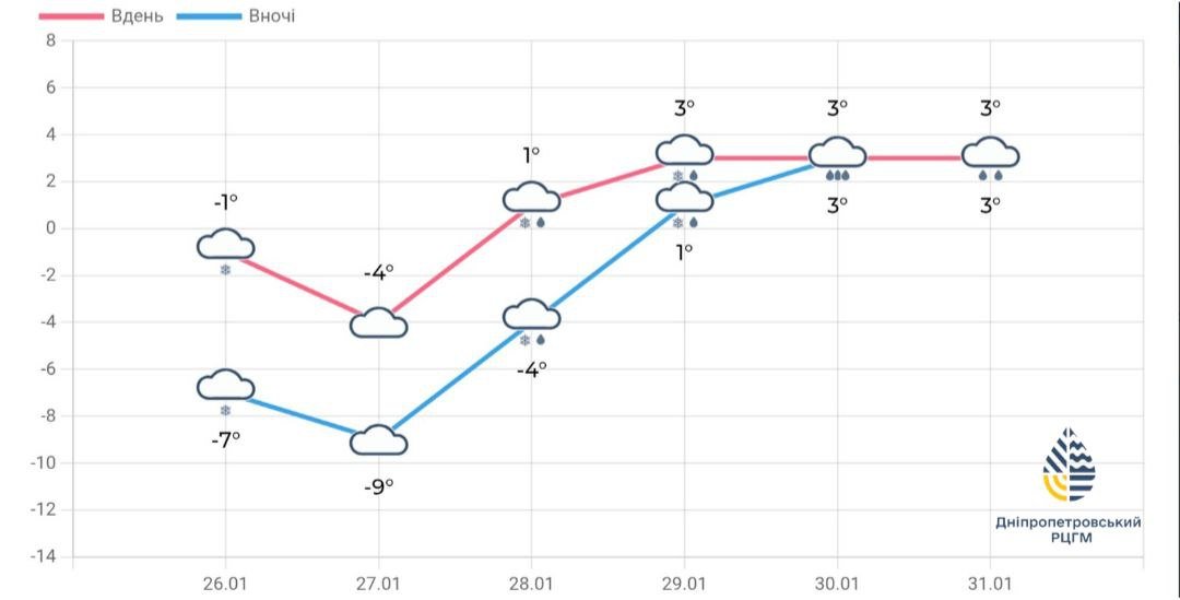 - Температура по м. Дніпро: вночі -7..-9° вдень -3..-5°