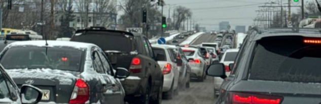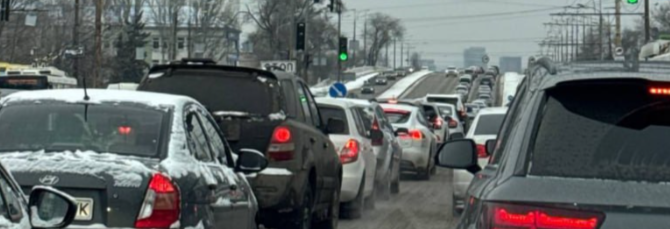 На Слобожанському проспекті утворився масштабний затор. Причина — година-пік та негода, які значно ускладнили рух транспорту.