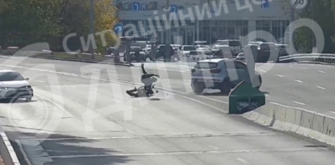Момент аварії потрапив на відео з камер спостереження. На записі видно, як байкер рухався в напрямку лівого берега, коли раптово врізався в легковик. Від удару чоловіка підкинуло у повітря — він перелетів через кермо та впав на дорогу.