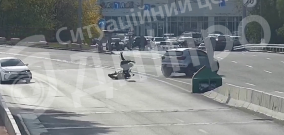 Момент аварії потрапив на відео з камер спостереження. На записі видно, як байкер рухався в напрямку лівого берега, коли раптово врізався в легковик. Від удару чоловіка підкинуло у повітря — він перелетів через кермо та впав на дорогу.