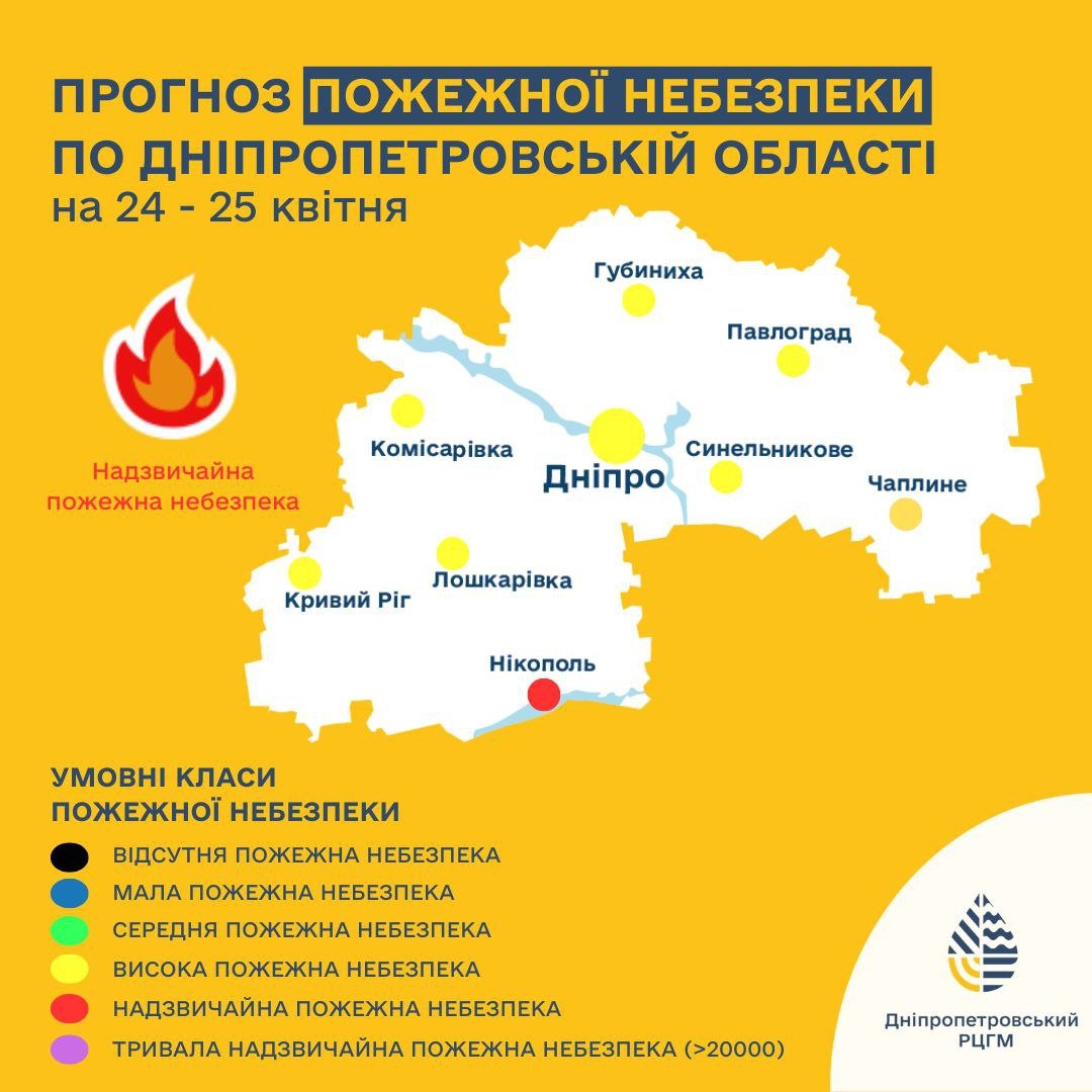 "24-25 травня по Дніпропетровській області очікується висока (IV класу), місцями надзвичайна (V класу) пожежна небезпека", – йдеться в прогнозі.
