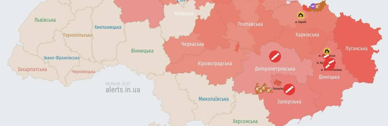 Увечері 9 вересня над Дніпропетровщиною оголошена повітряна тривога. Вона триває з 21:24 і станом на 23:00 все ще не скасована. Повітряні Сили ЗСУ попереджають про масований запуск ударних БпЛА, які рухаються в напрямку області.