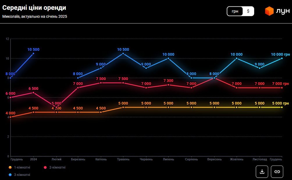 Ринок оренди у Миколаєві стабілізувався за останні пів року, суттєві коливання спостерігались лише на ціну трикімнатних квартир – у серпні-вересні вона впала до 8 тисяч гривень, зараз знову повернулась до 10 тисяч.
