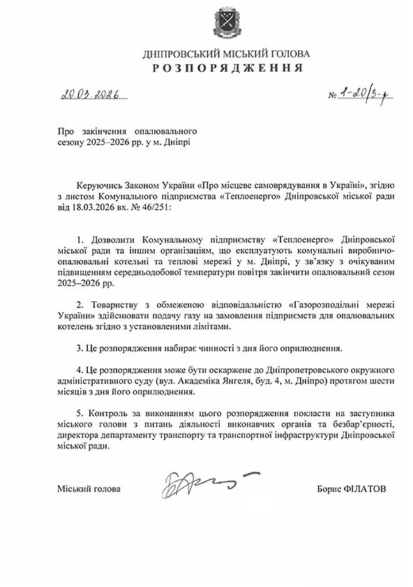 Мер Дніпра 20 березня 2026 року видав та підписав розпорядження про закінчення опалювального сезону. Тепер комунальники зможуть в будь який день вимкнути тепло, орієнтуючись на погоду.