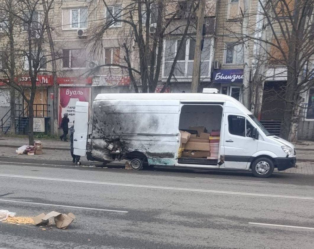 Сьогодні у Нікополі російський дрон атакував автомобіль, який перевозив великодню випічку. Унаслідок удару бус зазнав пошкоджень, а паски розлетілися просто на дорогу.