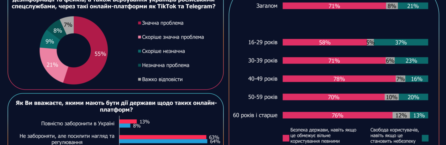 Більшість (63-64%) респондентів підтримують посилення державного нагляду та регулювання діяльності цих платформ. Лише 13% виступають за повну заборону TikTok та 8% – Telegram.