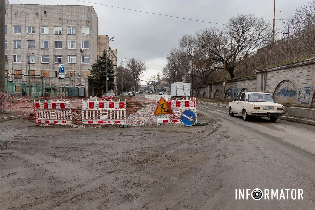 На початку березня у центрі Дніпра зафіксували одразу кілька обвалів дорожнього покриття. Їх огородили та засипали щебенем, однак деякі ділянки досі ускладнюють рух транспорту.