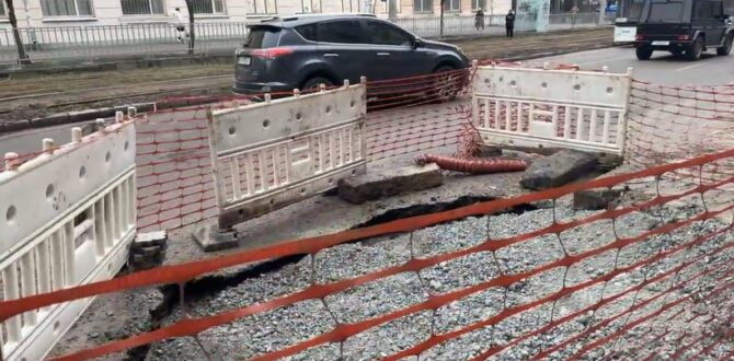 Ще одна небезпечна ділянка утворилася на проспекті Науки, навпроти колишнього Хіміко-технологічного інституту. Тут на проїжджій частині з’явилася велика яма, яку частково огородили сигнальними бар’єрами та дорожніми знаками. Водночас проблема ширша — асфальт просів і на сусідній смузі, що створює додаткові ризики для водіїв.
