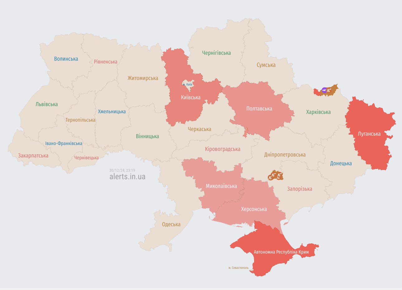 Станом на 23:20 мапа повітряних тривог України виглядала так: