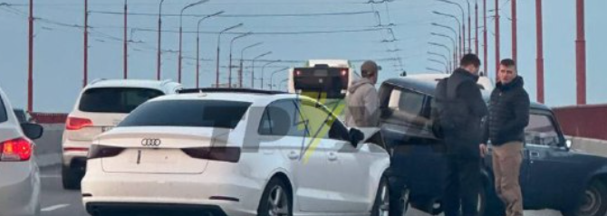 На початку мосту, в бік лівого берега зіштовхнулись дві автівки. ВАЗ сильно зім'яло: Audi на швидкості приплющила його до огорожі.