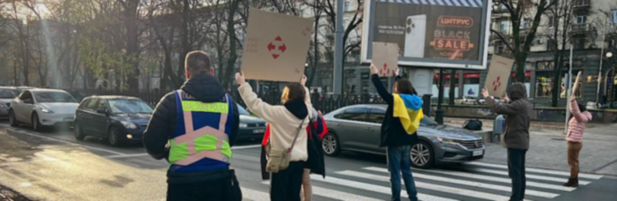 О 09:00 на одній із центральних вулиць Дніпра відбулася загальнонаціональну хвилину мовчання. Активісти вийшли на дорогу та підняли в гору плакати.