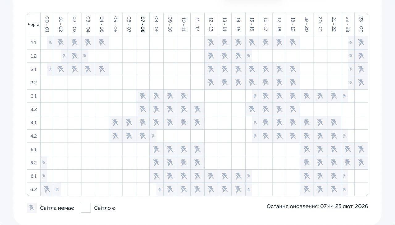 25 лютого у Дніпрі та області діють стабілізаційні графіки відключень світла. Вони трішки жорсткіші ніж планувалося напередодні. У середньому електроенергію вимикатимуть на 5–9 годин на добу, але для окремих груп обмеження триватимуть довше — до пізньої ночі.