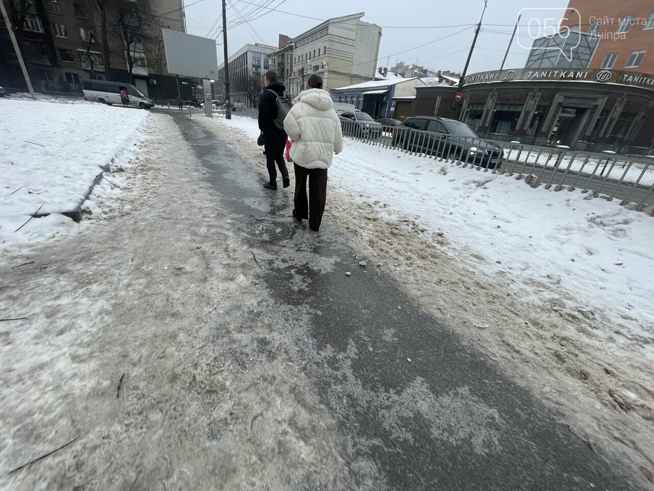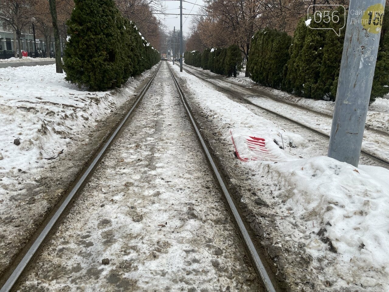 Колії обробили. Але залишаються окремі складності. Зокрема, близько 08:00 трамвай №1 довго не міг піднятися вгору на схил на просп. Яворницького. Через це на зупинці вони кілька трамваїв стояти вряд, пасажири виходили і йшли на автобуси.