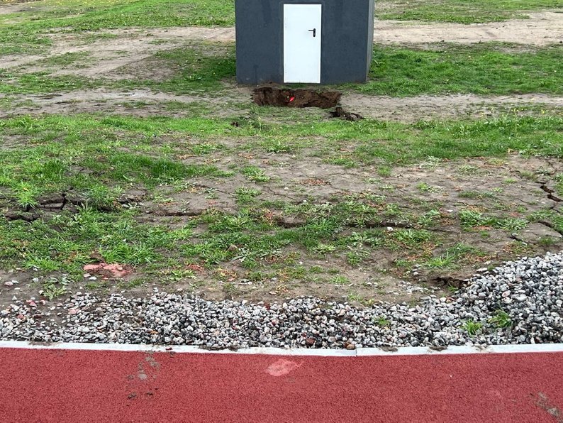 - Унаслідок сильної зливи та значного стоку води в чашу стадіону з прилеглої території відбулося часткове підмивання на межах насипного та природного ґрунту.