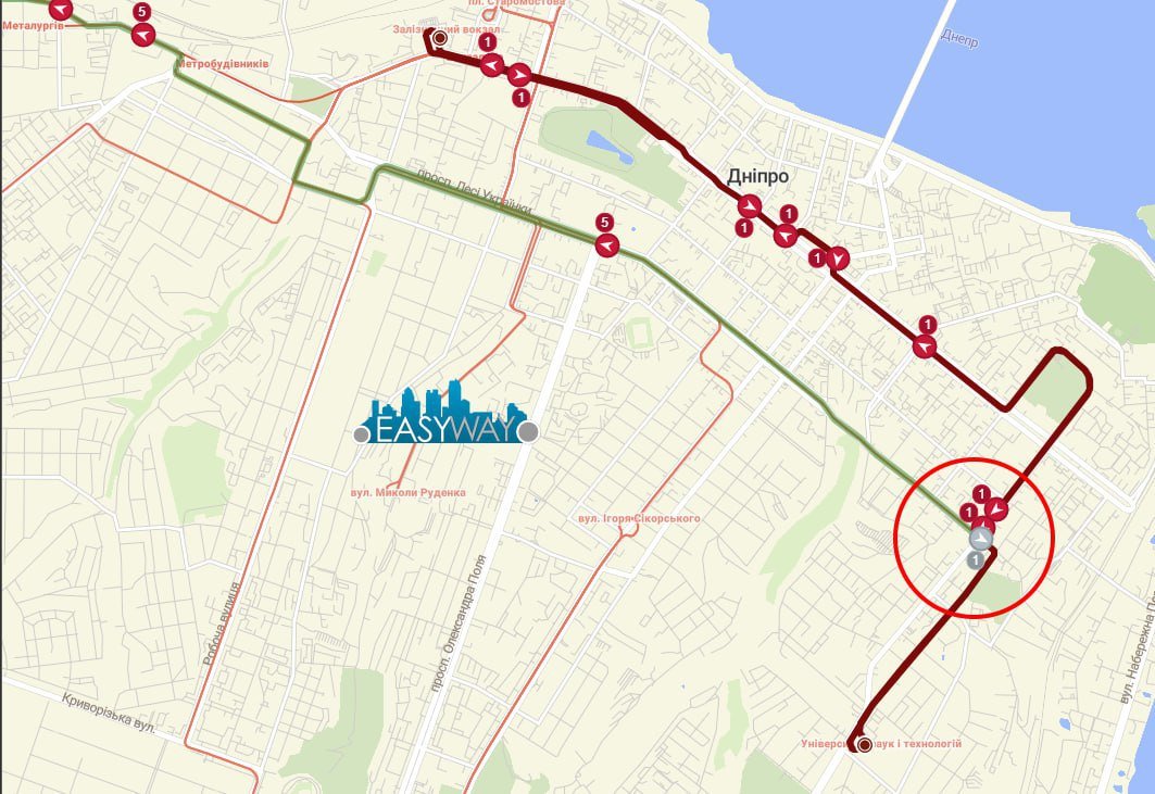 "Затримано рух 12 маршруту трамваю. Авторинок до Металовиробів. Рух організовано по 16 м-т. трамвая", – повідомляє Департамент транспорту ДМР.