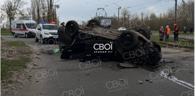 У Кривому Розі сталася дорожньо-транспортна пригода, внаслідок якої легковий автомобіль злетів з мосту та впав на дах. Інцидент стався на вулиці Романа Рибалки.
