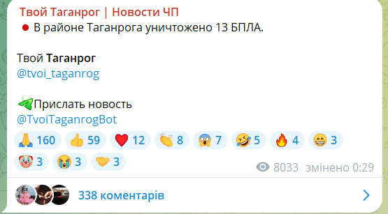 Між тим в мережі були оприлюднені кадри дронових атак. У пабліках пишуть, що Таганрог начебто під "потужною атакою" безпілотників, й стверджують, що нібито були збиті вже 13 БПЛА.