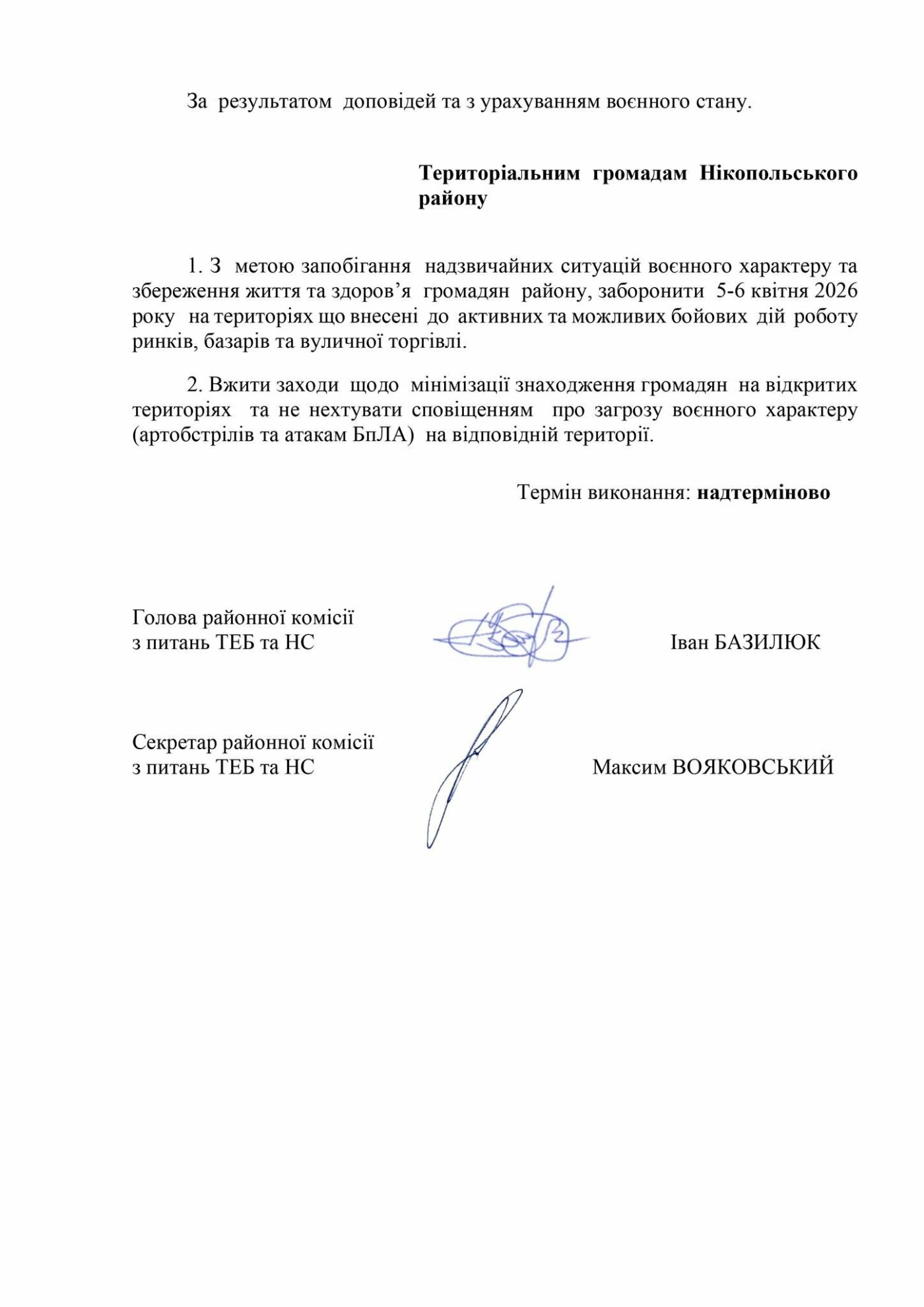 - 3 метою запобігання надзвичайних ситуацій воєнного характеру та збереження життя та здоровʼя громадян району, заборонити 5-6 квітня 2026 року на територіях що внесені до активних та можливих бойових дій роботу ринків, базарів та вуличної торгівлі.