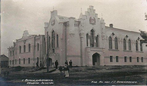 Будівля, відома як "Будинок земства" у Верхньодніпровську, була зведена наприкінці 1874 року в стилі неоготики за проектом архітектора Едуарда-Юліана Харманського. Цей архітектор поєднував посаду молодшого інженера Катеринославського губернського правління, що свідчить про високий рівень професіоналізму та значущість будівлі.