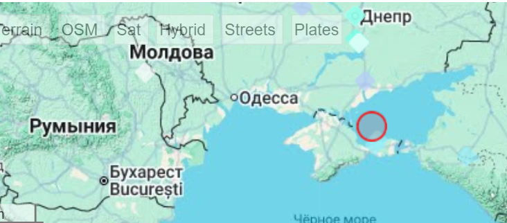 • Епіцентр широта/довгота 45.784°N / 35.614°E, Україна