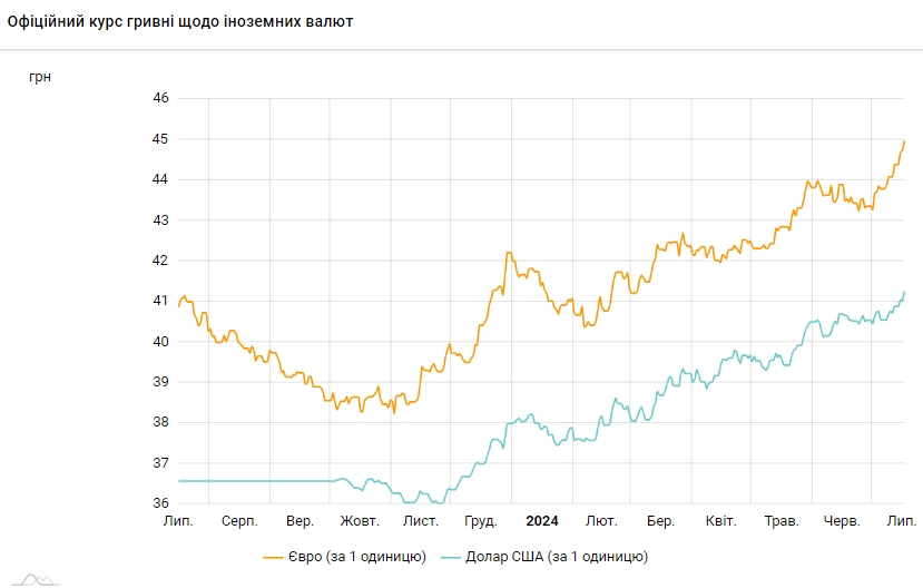 Курс євро становитиме 44,9789 гривень за 1 євро (+0,2526 грн). Це також максимум. Вище курс був 16 липня – 44,7263.
