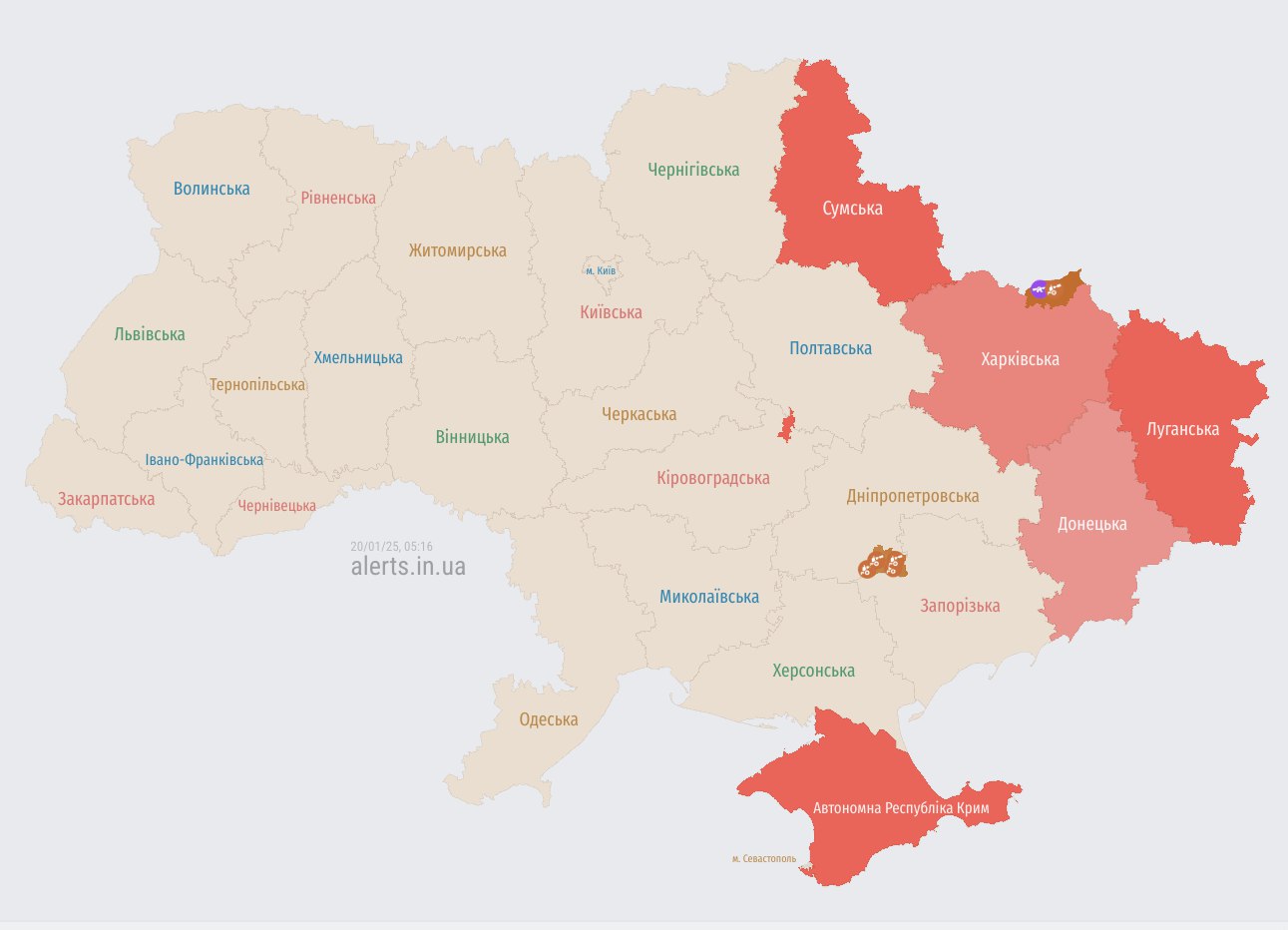 Ввечері у неділю, 19 січня, російська армія знову атакує Україну дронами-камікадзе типу "Шахед". У низці областей оголошено повітряну тривогу, працюють сили ППО.