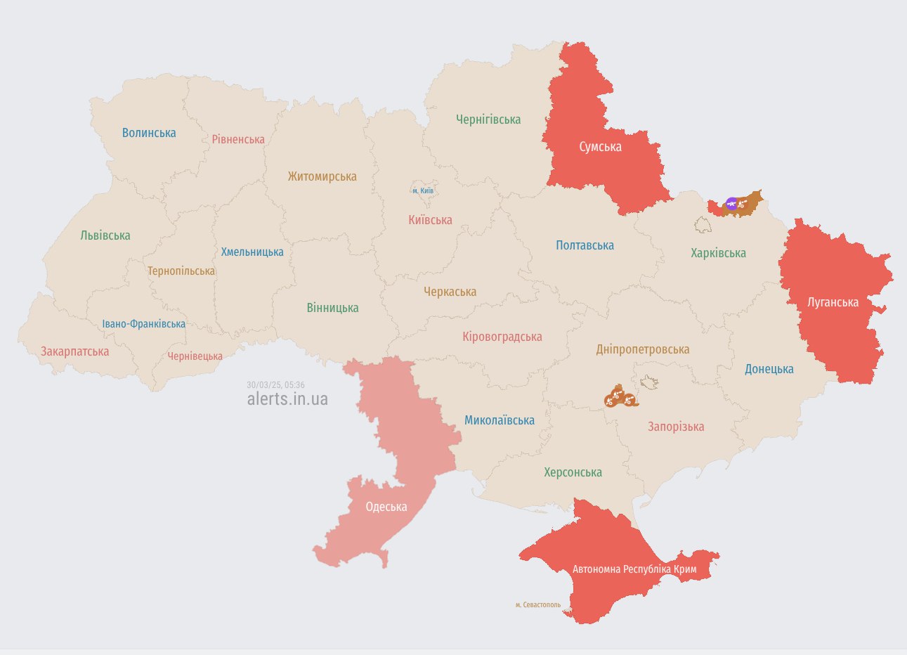 Станом на 05:36 карта повітряних тривог України виглядала так: