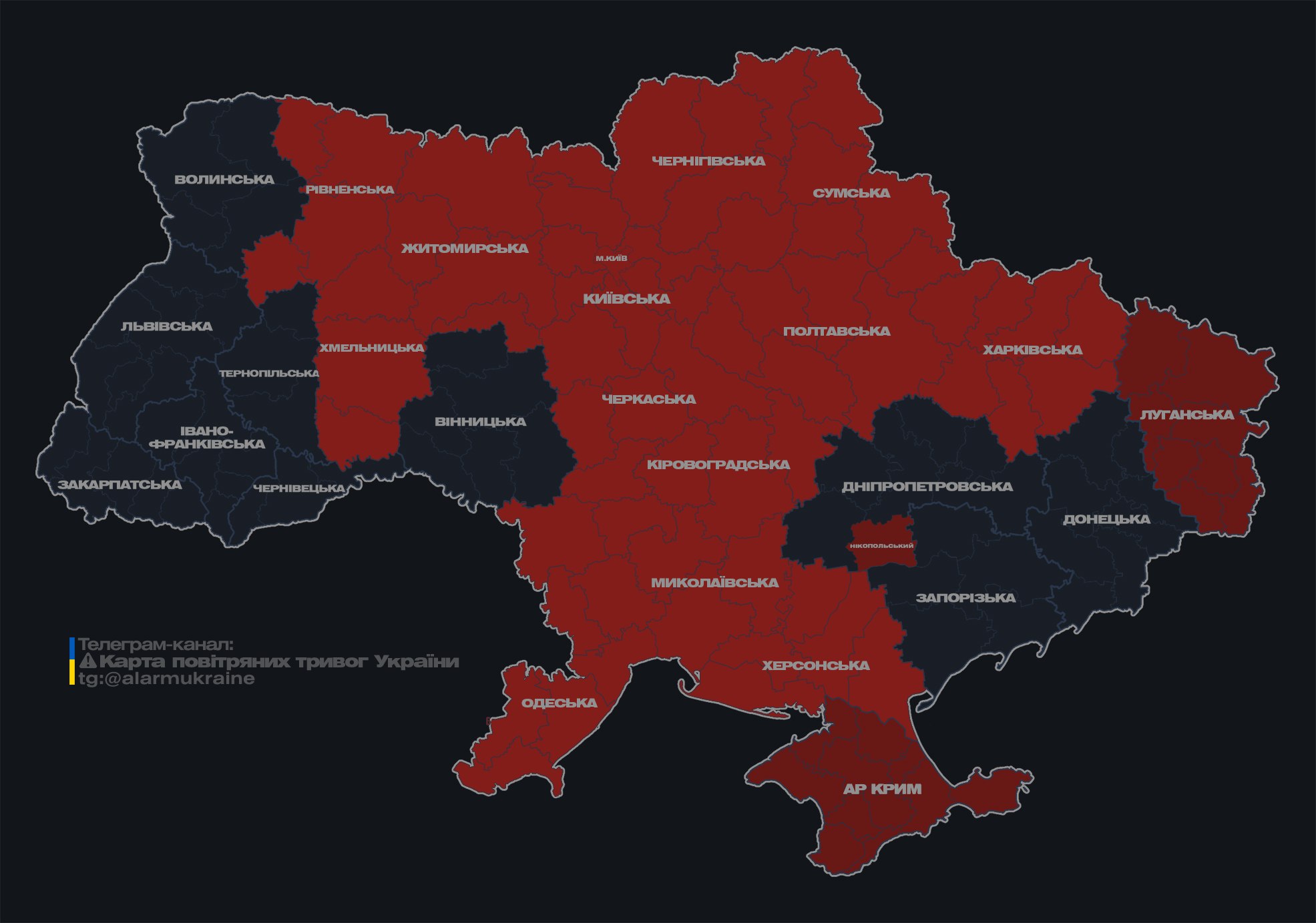 Наразі мапа повітряних тривог України виглядає так:
