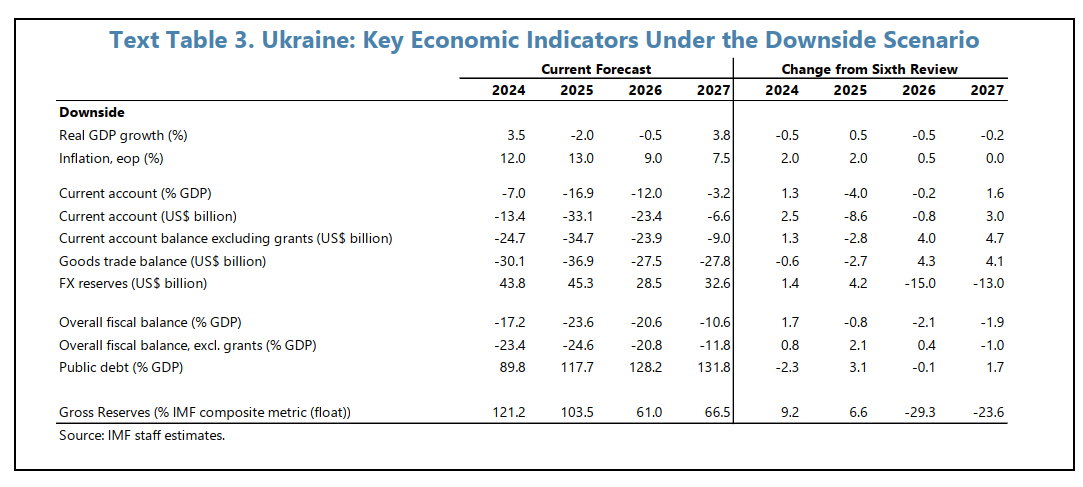 Сукупний дефіцит фінансування в негативному сценарії оцінюється в 162,9 млрд доларів, що на 14,1 млрд доларів вище базового прогнозу (148,8 млрд доларів). Цей обсяг розрахований на весь час дії програми з МВФ (другий квартал 2023 року – перший квартал 2027 року).